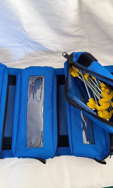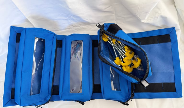 Because of this, we can specialize in handcrafted utility bags tailored to your needs, featuring personalized designs that showcase company logos, family names, or fun elements to reflect your unique style.